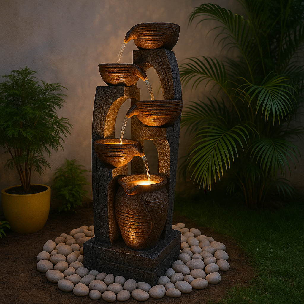 Transform your garden into a meditative sanctuary with this striking tiered water fountain, thoughtfully designed to bring serenity and spectacle to your outdoor space. Measuring 54 inches in height, the fountain features four cascading bowls, flowing gently into a textured pebble bedβwith warm LED lighting enhancing its visual allure.