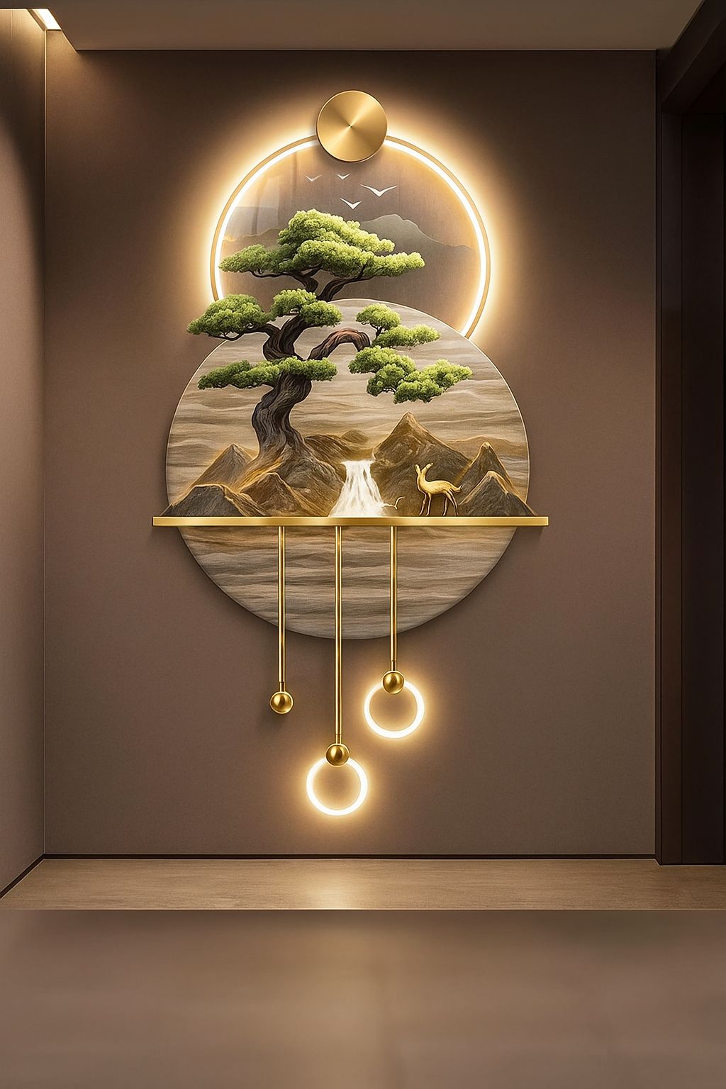 Illuminated Crystal Wall Art – Golden Deer & Waterfall