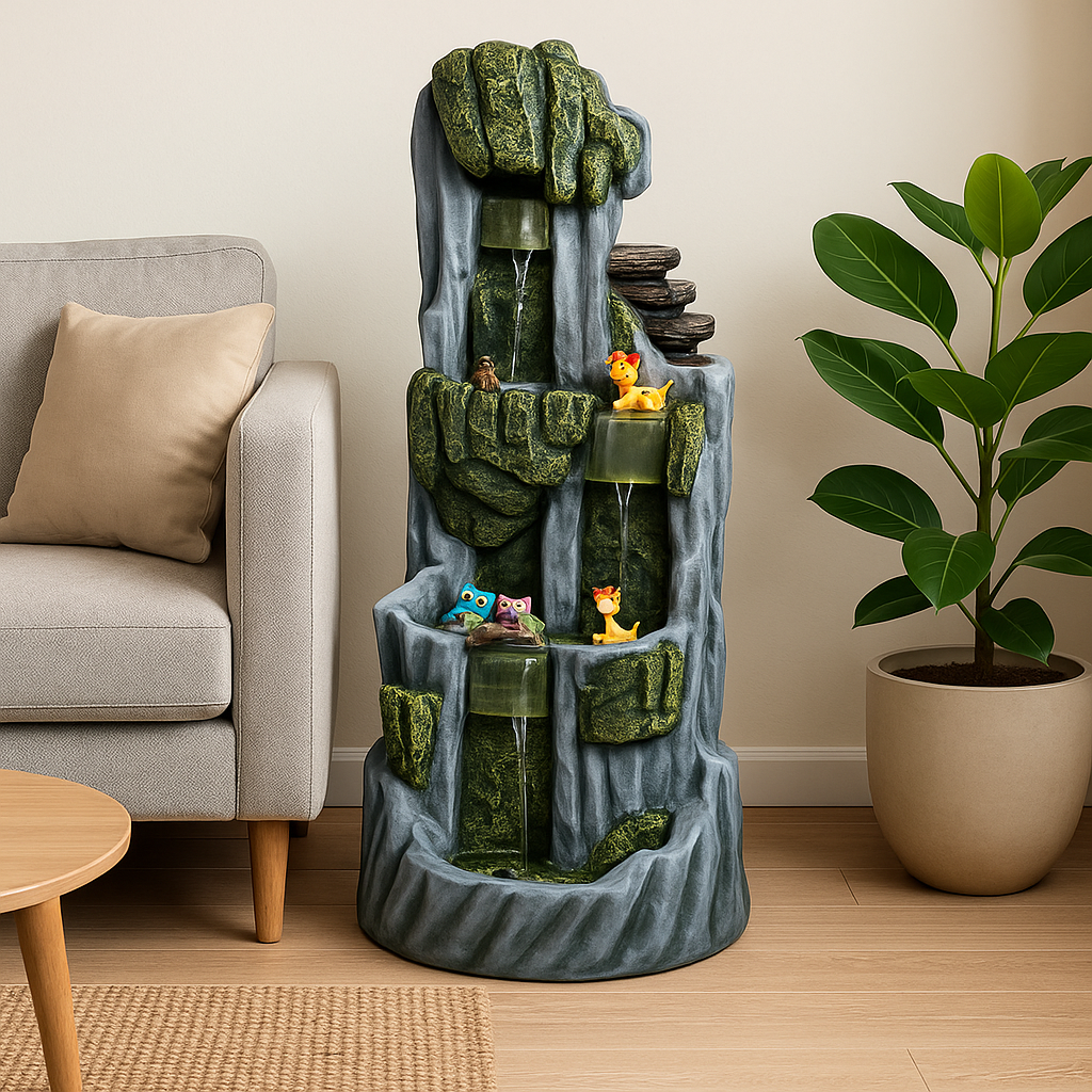 Transform your space with the majestic Super Jumbo Fountain, a 5.3-foot tall statement piece crafted from durable unbreakable fiber. Featuring whimsical cartoon owls and giraffes on a multi-level rocky waterfall design, it’s perfect for modern living rooms, balconies, or office spaces. Designed to bring calmness and charm, this fountain adds a playful yet serene vibe to any corner.