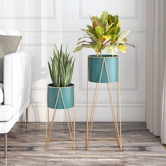 Planters for Indoor - Outdoor Plants & Modern Metal Floor Tall Plant Stand for Garden, Balcony & Living Room & with Pots Set of 2 Flower Pots (Green)