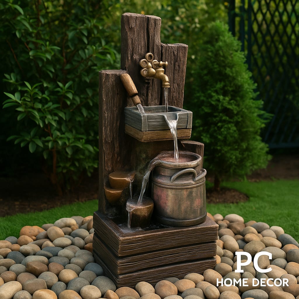 Bring charm and serenity to your garden or indoor space with this handcrafted Rustic Barrel Water Fountain from PC Home Decor. Designed to resemble a vintage village tap setup, this piece features realistic detailing—complete with a faucet, wooden basin, and flowing water that gently cascades down into a rustic-style barrel.