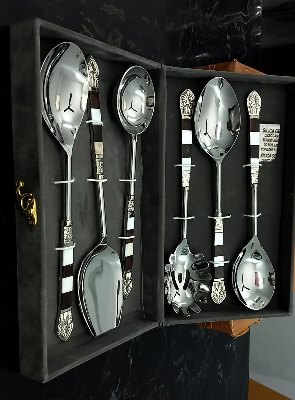 Enhance your dining elegance with our Mother of Pearl (MOP) Handle Serving Spoon Set, a luxurious collection of 6 finely crafted stainless steel serving spoons. Each piece features a sleek black-toned MOP handle with intricate silver-finish end caps, blending traditional craftsmanship with modern sophistication.