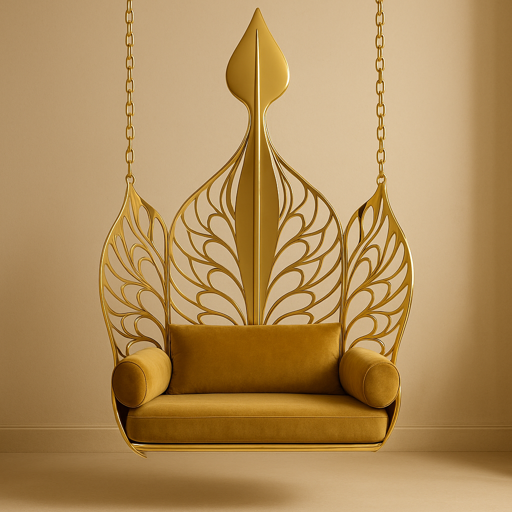 Inspired by Lord Murugan’s divine Vel and the majestic elegance of peacock feathers, the Vel Ascend Throne is a celestial blend of sculpture and comfort. Designed for spiritual living spaces, this stainless steel swing features a tapering Vel-shaped spine, laser-cut wing panels, and plush velvet cushions to invite serene relaxation.